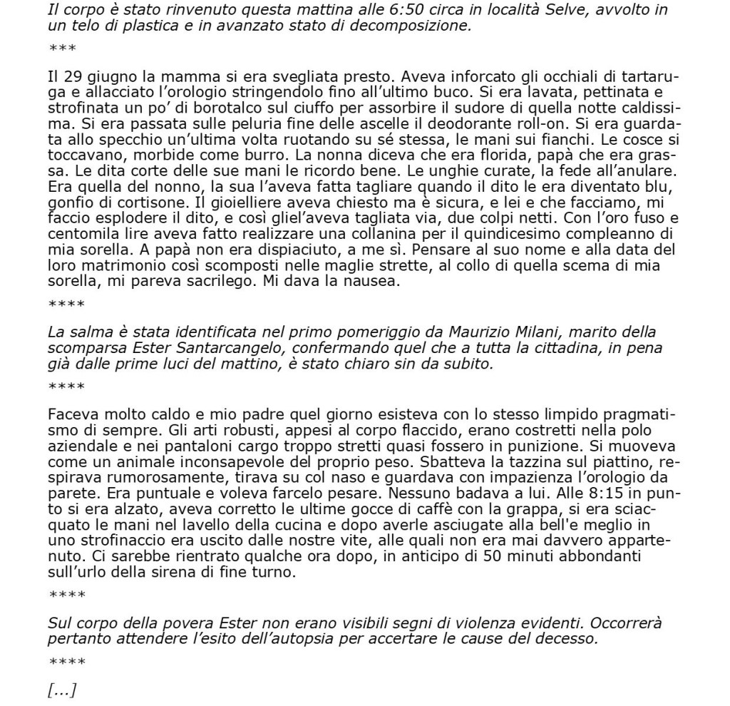 la settimana scorsa durante una lezione ho raccontato della necessità di farsi attraversare dal testo anche quando non è limpidissimo e revisionato alla perfezione. Se la storia avanza, ho detto, se i personaggi ci sono e la scrittura vi prende, non bisogna far caso a piccole ripetizioni, assonanze, refusi, frasi che non girano benissimo e via dicendo. Che importa! Quando si entra in una storia l’ultimo dei problemi è soffermarsi su ogni singola parola. L’editing non è solo aggiustare le parole, l’editing è prima di tutto mettersi alla ricerca di suoni (ascoltandoli), di immagini (osservandole), di atmosfere (calandocisi dentro) e protagonisti (cercandone la vividezza), e così riconoscere una voce. Io qui conosco i protagonisti quando la madre dice “che facciamo mi faccio esplodere il dito”, quando la voce narrante chiama scema la sorella, quando il padre si alza puntuale e corregge il caffè con la grappa ma nessuno bada a lui. Vedo immagini nelle cosce come burro, negli arti robusti appesi al corpo flaccido, sento i suoni dello stofinìo del borotalco, della fusione dell’oro, della sirena di fine turno. Nulla m’importa del refuso “sulle peluria”, del possessivo “sua” che non rende immediatamente chiaro della fede di chi si stia parlando, dell’assonanza degli arti costretti nei pantaloni troppo stretti, ecc. Ragiono semmai sulla natura dei corsivi, e ne immagino già i potenziali difetti (troppo brevi? troppo ravvicinati? troppo frammentata la narrazione?) e mi domando se potrebbero essere un ostacolo allo sviluppo della vicenda, ma mentre me lo chiedo so che di questa vicenda voglio saperne di più, di questa madre (a proposito della domanda che mi poni: si capisce subito che la madre è ***? sì, direi che si capisce) voglio saperne di più, e voglio sapere della vita di chi resta con un padre pragmatico e una sorella scema.