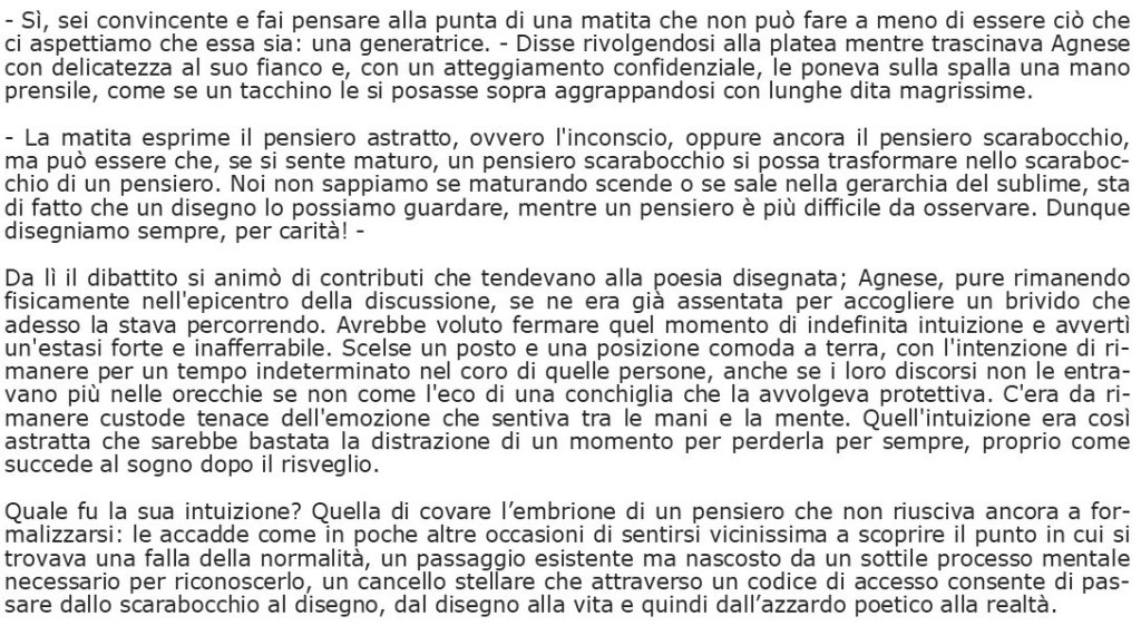 Mi convince meno l’idea che “tutta la storia di Agnese viene raccontata come un pretesto, per giustificare ciò che veramente volevo scrivere”: mai scrivere pretesti, secondo me, sempre scrivere direttamente ciò che veramente vuoi scrivere.