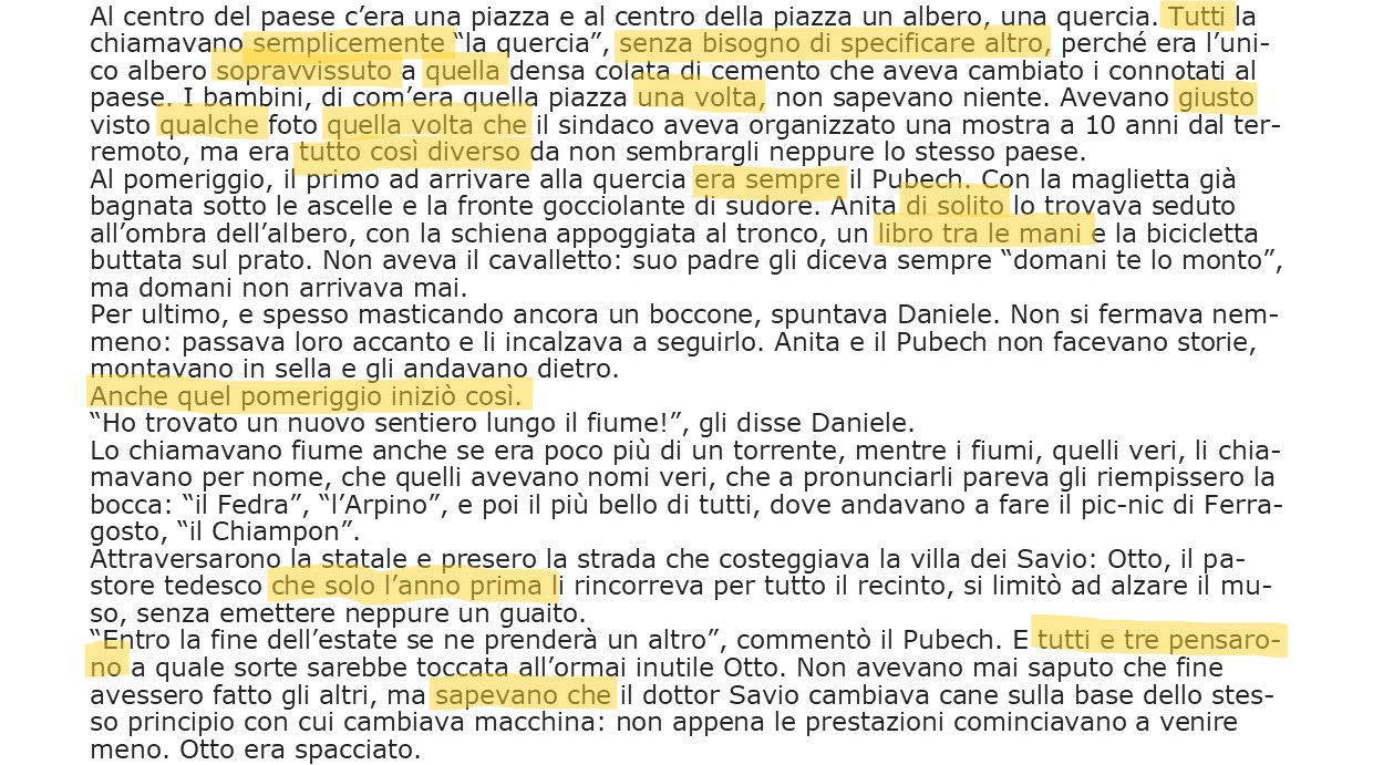 questo inizio molto classico e molto visibile mi sembra ben congegnato. Si comincia dalla piazza e dal suo simbolo di riconoscimento (che immagino avrà poi un ruolo nella trama; ce l’avrà, vero?) per introdurre il contesto (piccolo paese, sindaco, terremoto 10 anni fa, bambini) e i protagonisti: i bambini appunto. Biciclette, fiumi, libri, cani. Potremmo essere dalle parti del romanzo di formazione, se poi questi bambini li vedremo crescere e farsi adulti; dalle parti del romanzo sociale, se poi questi bambini oltre alla piazza di cemento che già ha cambiato i connotati al paese vedranno arrivare novità più ingombranti; dalle parti del romanzo del trauma se uno di loro morirà o subirà qualcosa di irreparabile lasciando gli altri a farci i conti; dalle parti di Stephen King, se poi questi bambini li vedremo avere a che fare con l’ignoto. Potrebbe essere ancora tutto, e questo vuol dire che potrebbe essere ancora niente, ed è il rischio che devi scongiurare.