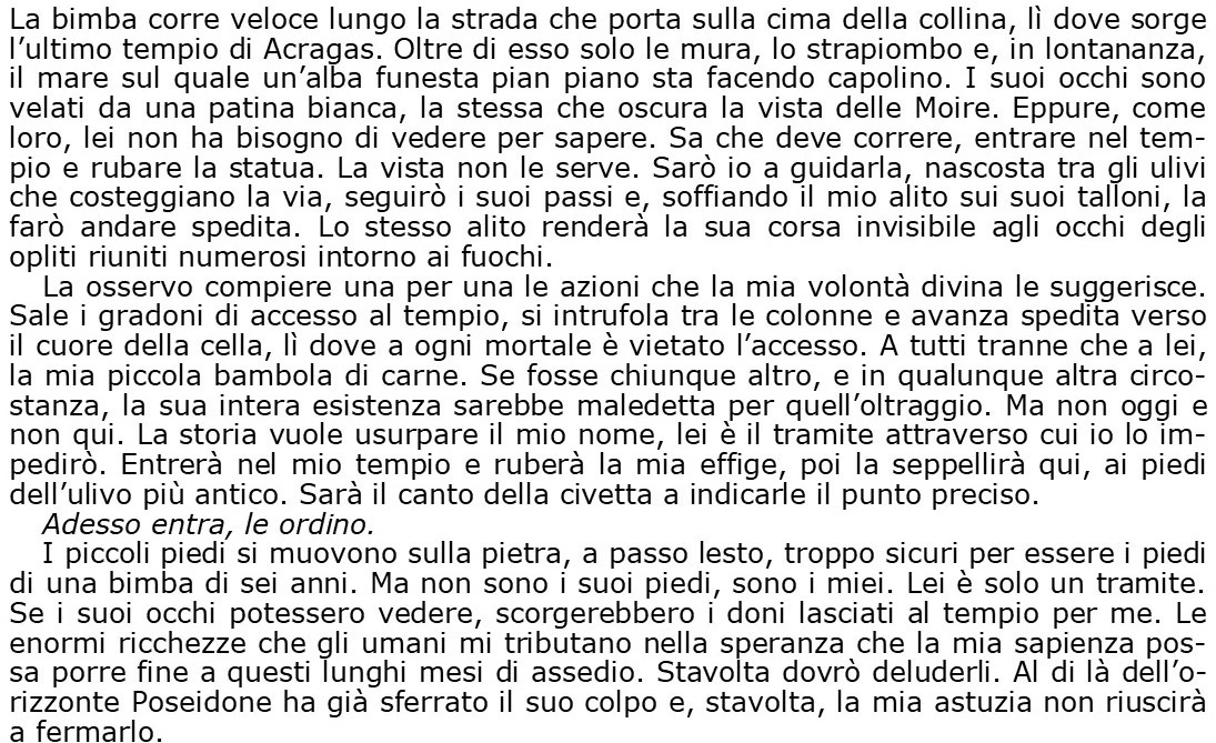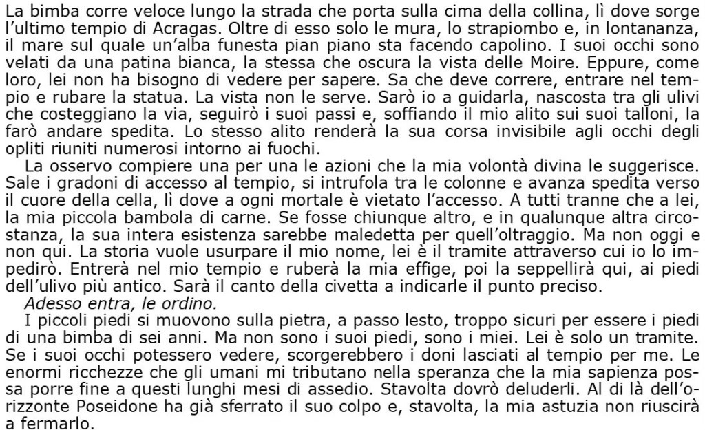 Non era mai sola/Mai un cazzo di momento in cui potesse sedersi e lasciare andare la testa/C’erano urla che le aprivano crepe nel cervello/lei tremendamente lenta/Parlare e non sentire quello che le rispondevano/Condannata a sorridere senza riuscire a seguire un filo, senza essere in grado di formulare una frase di senso/così inutile, così trasparente, così fastidiosa a livello di decibel/sulla lingua nessuna parola giusta o connessione logica/Ci aveva provato, a capirlo, mille e mille volte/Alcune sere aveva urlato anche lei, era diventata pazza/avrebbe voluto ingoiarsi la lingua, e si era schiacciata forte la testa tra i palmi.